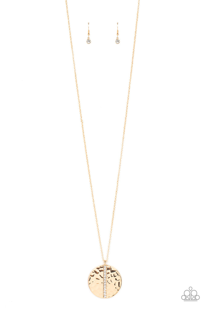 An icy row of glittering white rhinestones is pressed into the center of a hammered gold disc, splitting the oversized pendant seemingly in two as it swings from the bottom of an extended gold chain for a dramatic effect. Features an adjustable clasp closure.