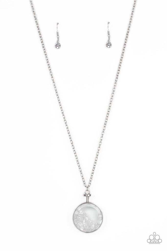 A glitzy collection of twinkly white crystals sparkle inside a faceted glass and silver fitting, resulting in a glittery trinket at the bottom of an extended silver chain. Features an adjustable clasp closure.