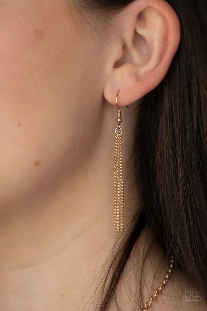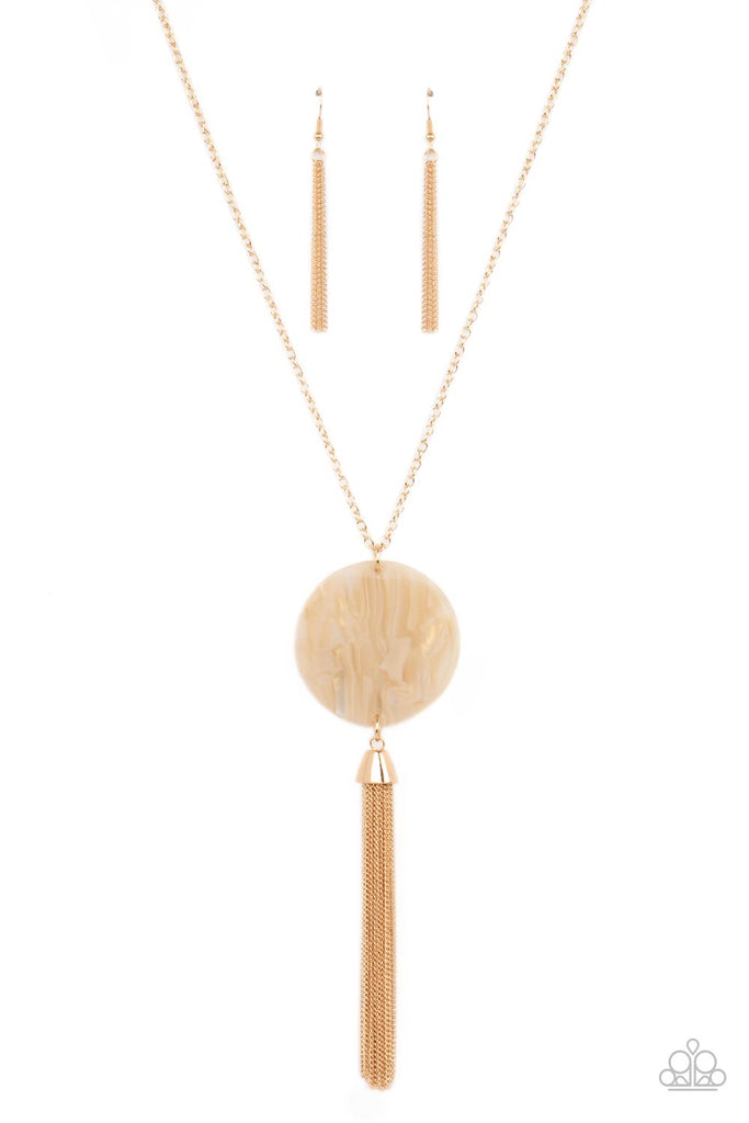 A dramatic gold chain tassel swings from the bottom of an oversized shell-like acrylic disc, creating a fabulously stacked pendant at the bottom of a lengthened gold chain. Features an adjustable clasp closure.