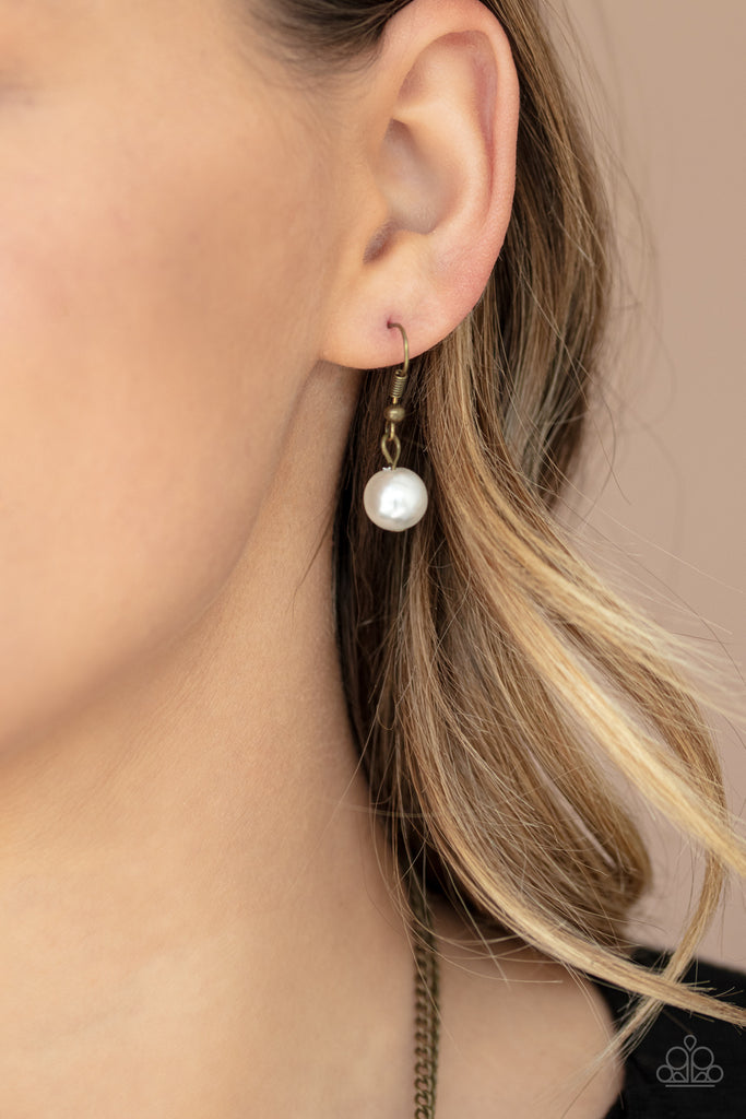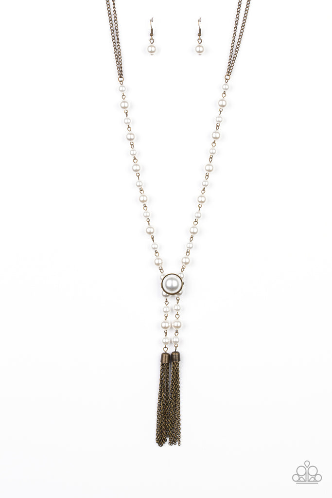 Pearl dotted brass chains give way to two brass chain tassels. Featuring an oversized pearl, an elegant brass fitting delicately pinches the strands together, creating a vintage inspired look. Features an adjustable clasp closure.